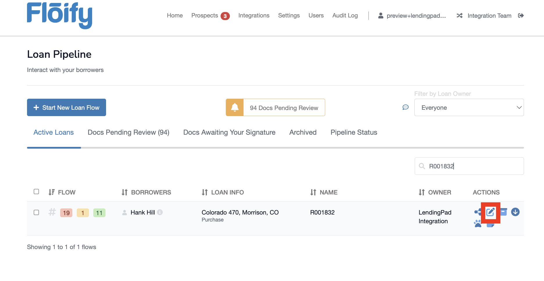 Select the edit loan flow button (pencil/paper icon) towards the right of the borrower's name in your loan pipeline: