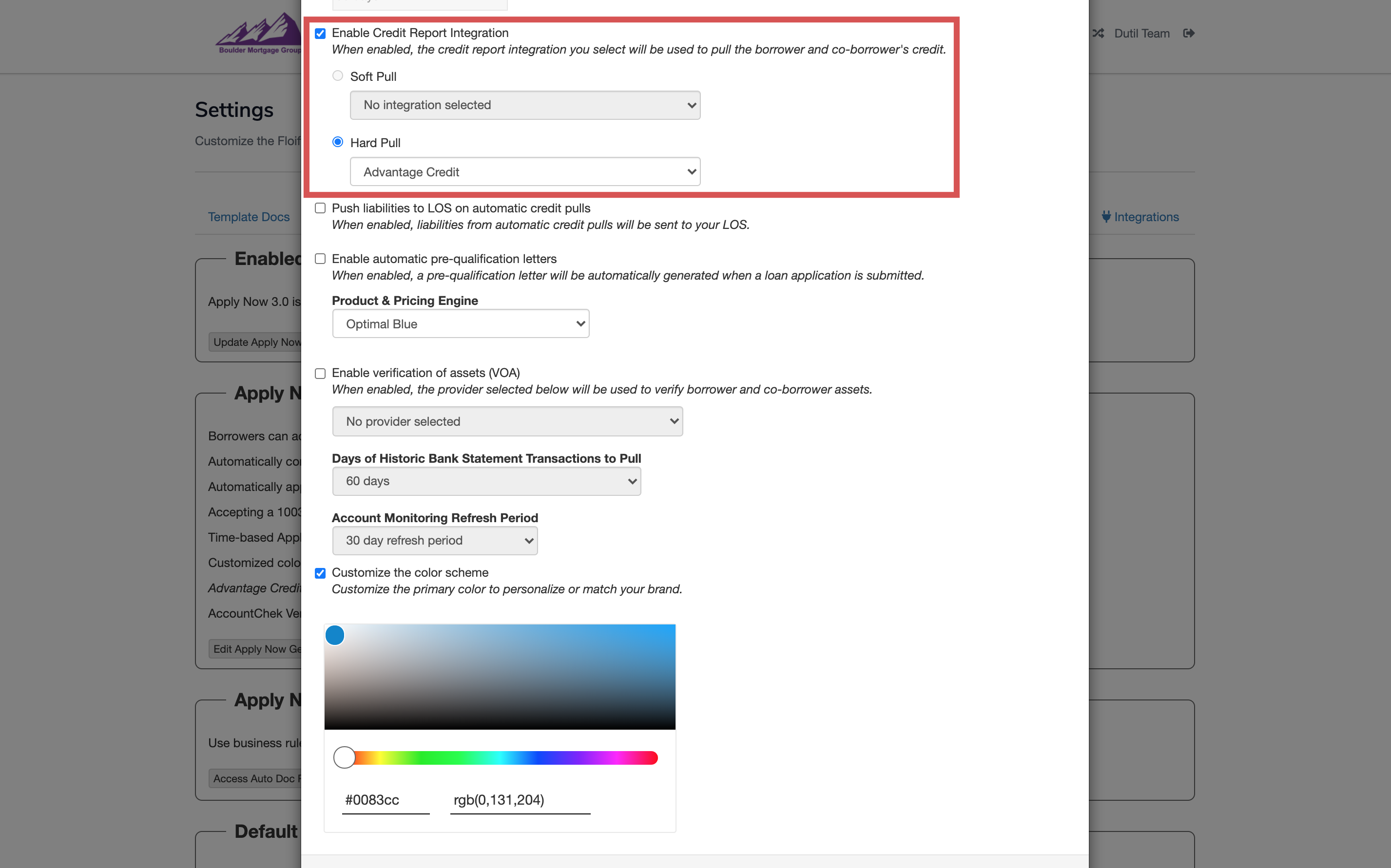 Select the option Enable Credit Report Integration and select soft or hard pulls. Select the credit vendor from the dropdown. Make sure you select Save to confirm the changes: