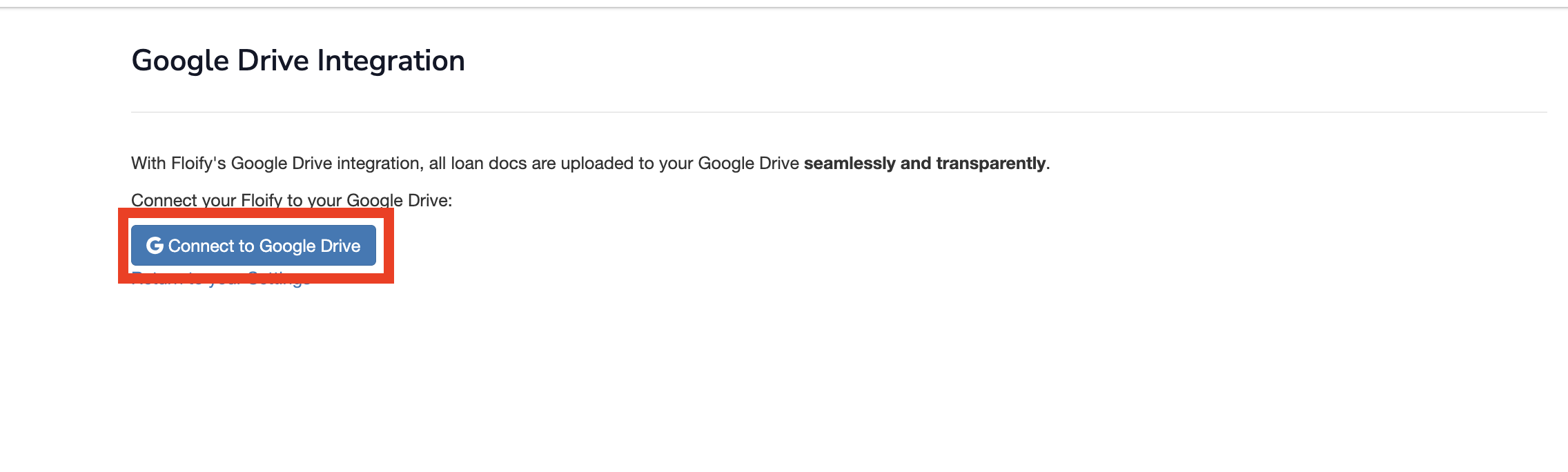 Floify's integration with the Google Drive cloud storage platform allows originators and their teams to seamlessly connect their existing Google Drive account to Floify.
