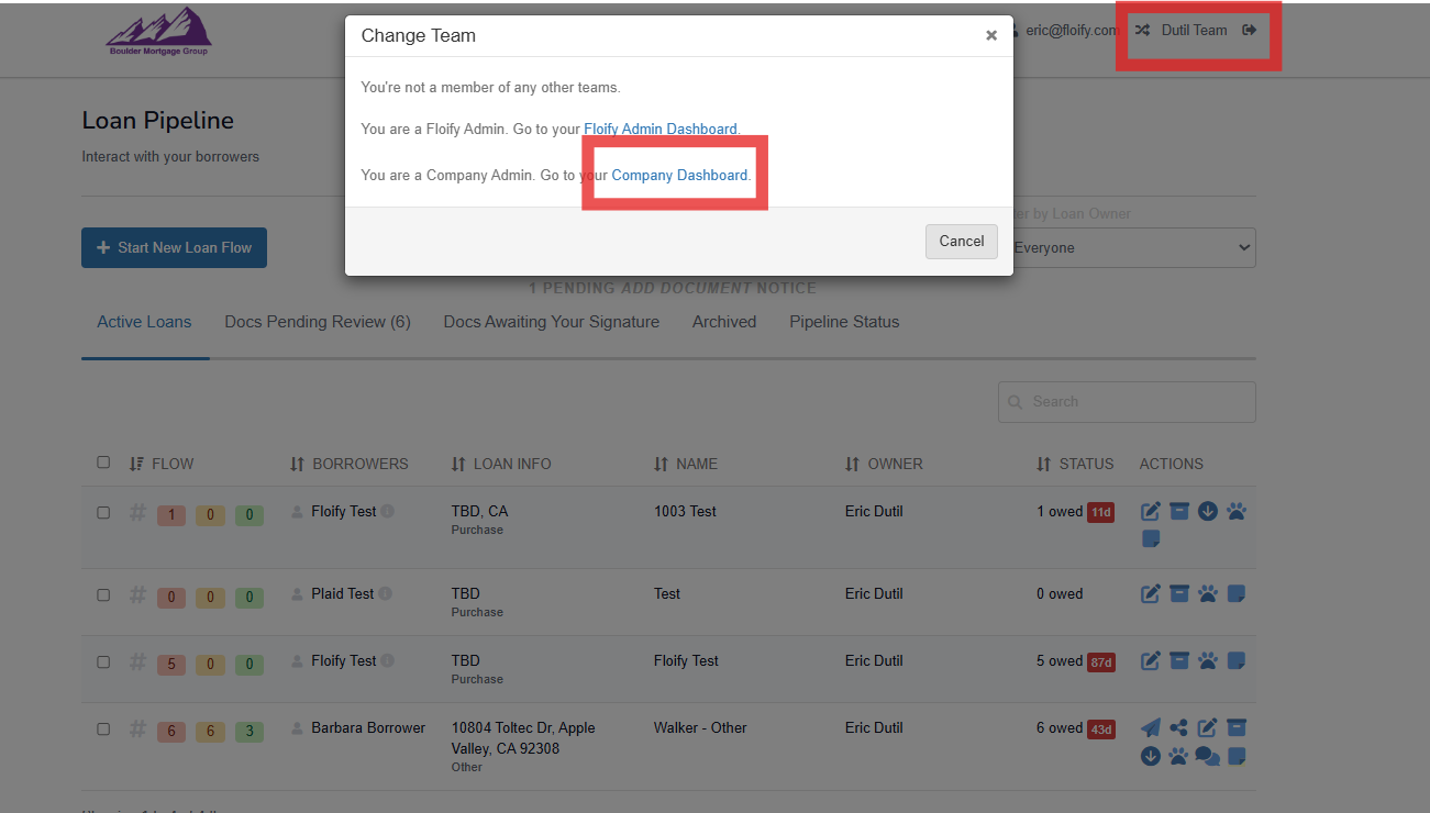 From the team pipeline, choose the team name in the upper right-hand corner and select the option to navigate to the Company Dashboard: