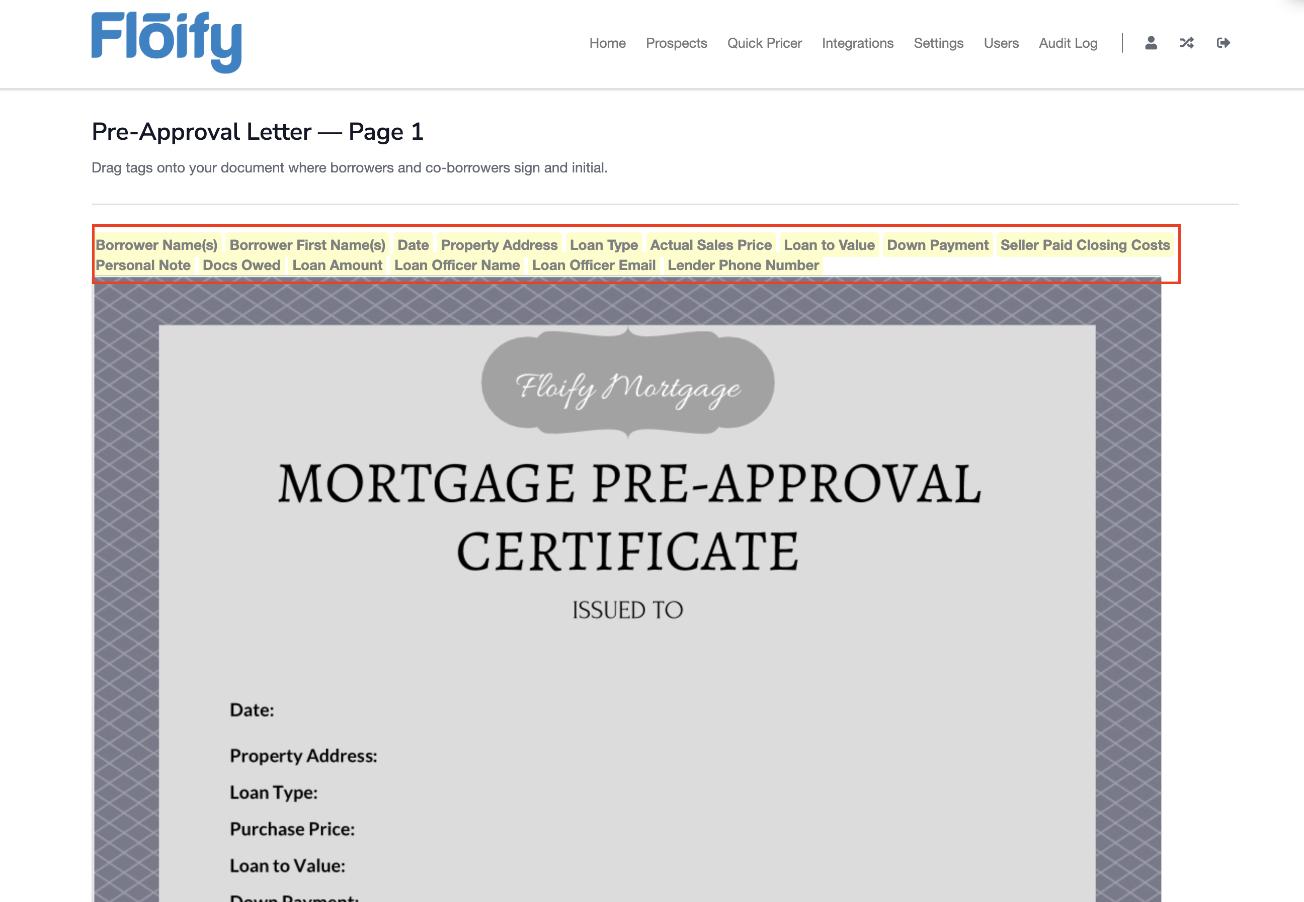 To customize your pre-approval letter, you will upload your document and then drag and drop fields onto your template. When your partner generates a pre-approval letter, Floify will pull borrower information from the loan and populate those fields automatically.