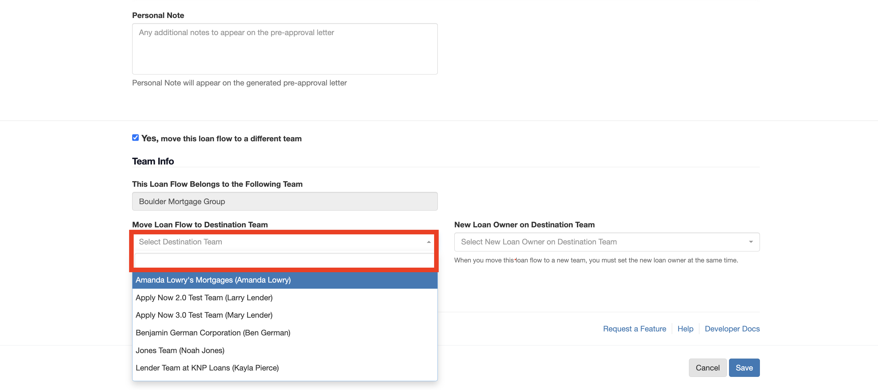 You will see two drop-down menus; one with the team names in your company to select a destination team, and one with the individual users on that team to select a loan owner. Choose the desired options from the searchable drop-down menus.