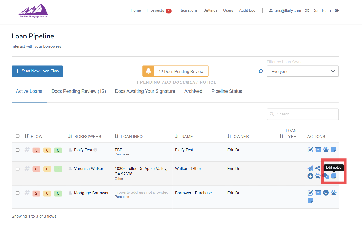In your team pipeline, locate the loan flow for the borrower that you'd like to edit, then click on the Edit Notes (sticky note) action icon towards the right hand side: