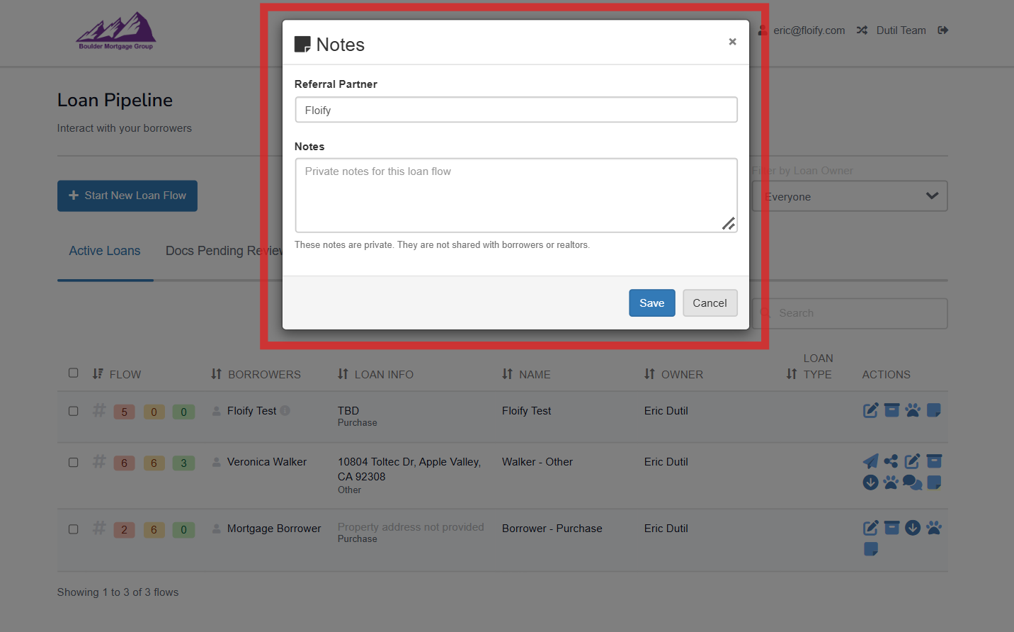 The Notes section allows you to enter private, internal notes for the loan flow. These will not be visible to realtors/partners or borrowers. There is also a Referral Partner slot available for your reference if the borrower has indicated this on the loan application. Make sure you select Save to confirm any changes made: