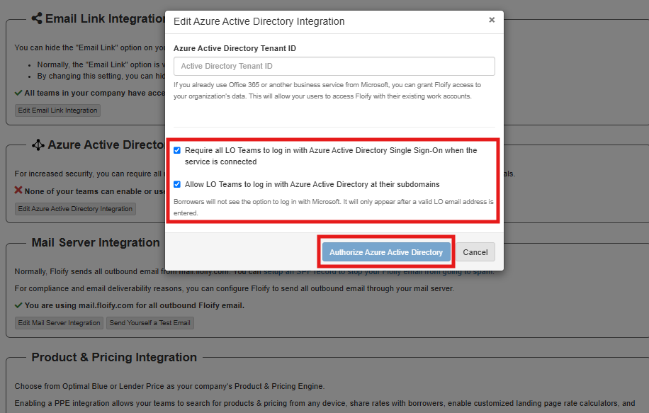Enter your Azure Active Directory Tenant ID and select the option to Require all LO teams to log in with Azure Active Directory Single Sign-On when the service is connected. You can optionally enabled the Allow LO Teams to log in with Azure Active Directory at their subdomains to give subdomain access in addition to app.floify.com. Make sure you select Authorize Azure Active Directory to confirm the change: