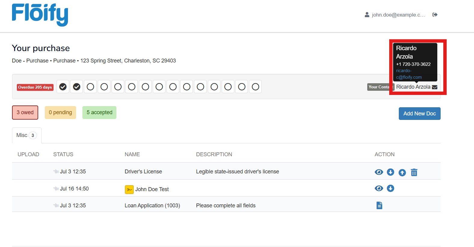 Towards the right of your document tabs, you'll see your lender's name listed. If you hover over the name, this will display the contact information: