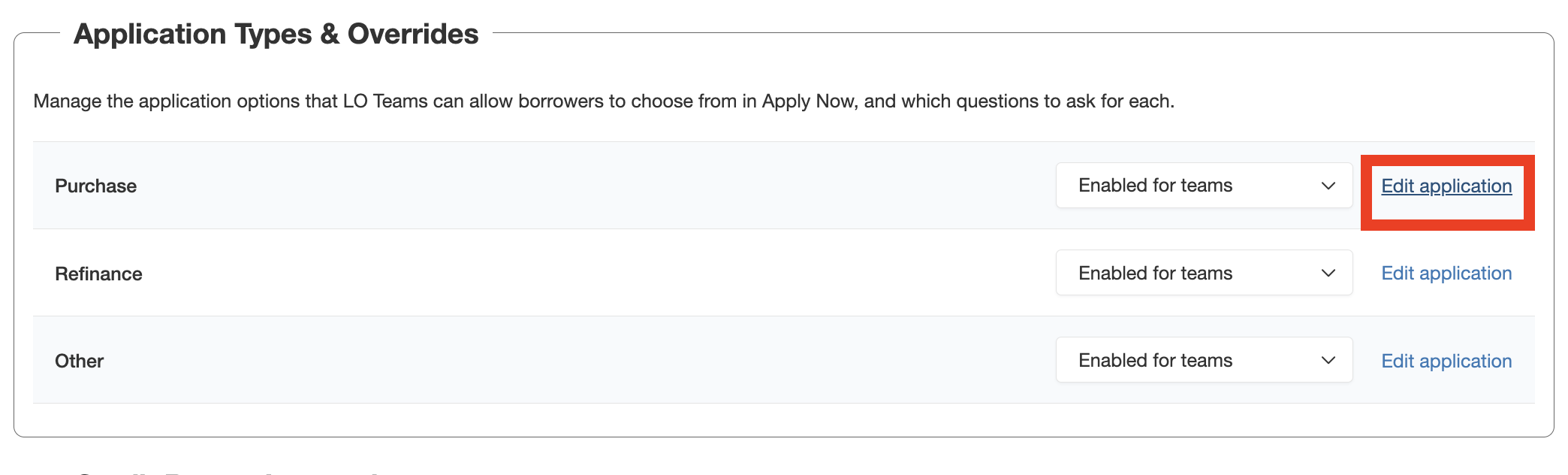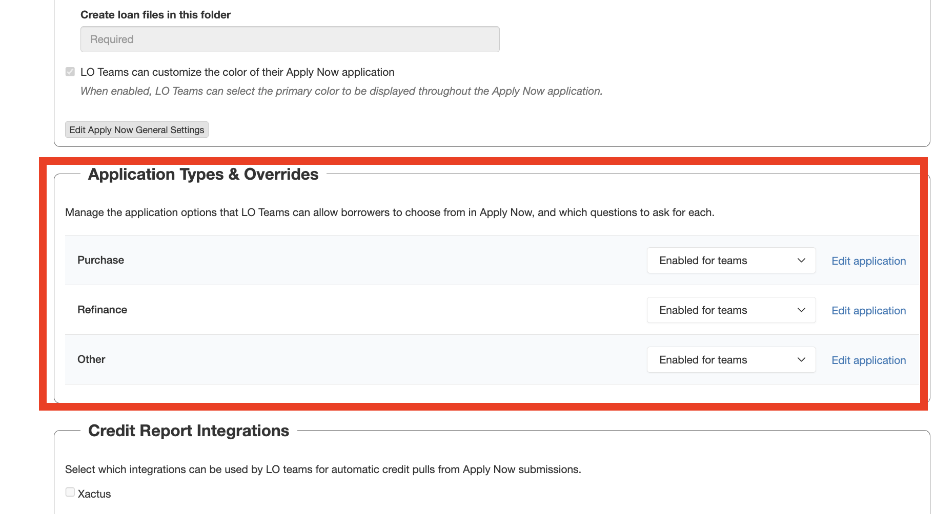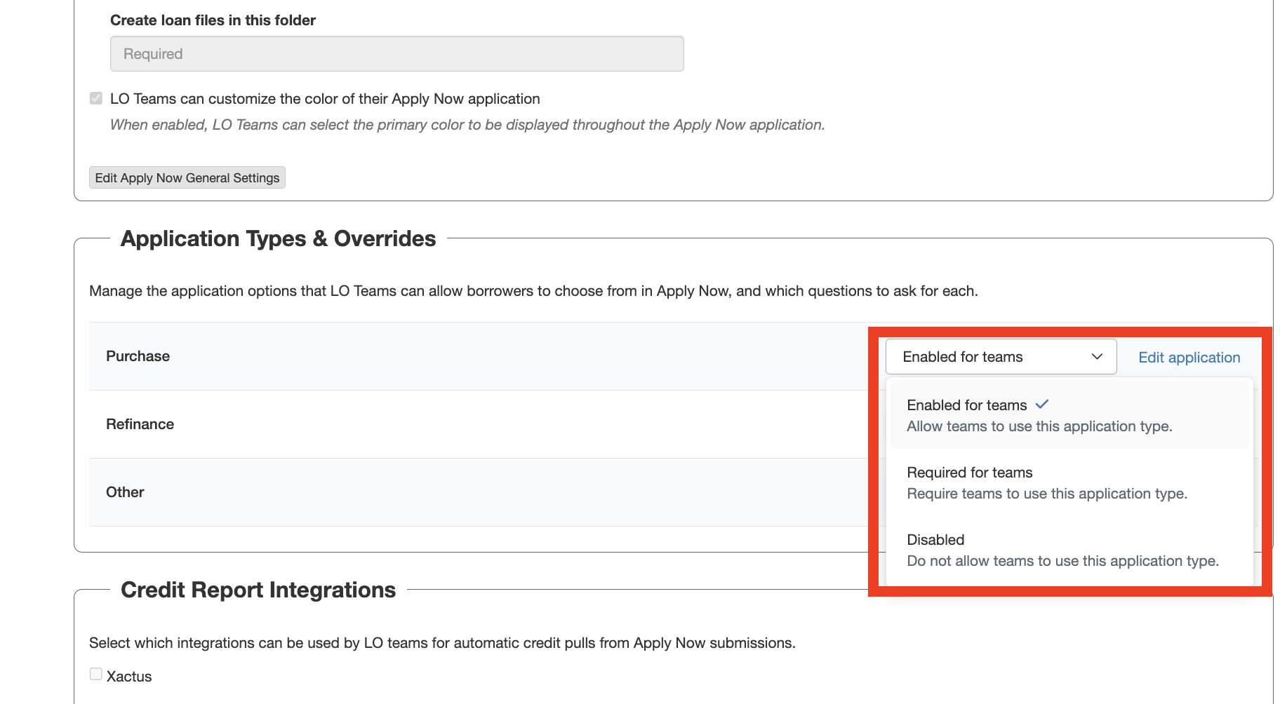 You can select the application types you would like your teams to have enabled for from among Purchase, Refinance, and Other, and can choose if they are required for usage by teams by selecting the drop down menu associated with each type