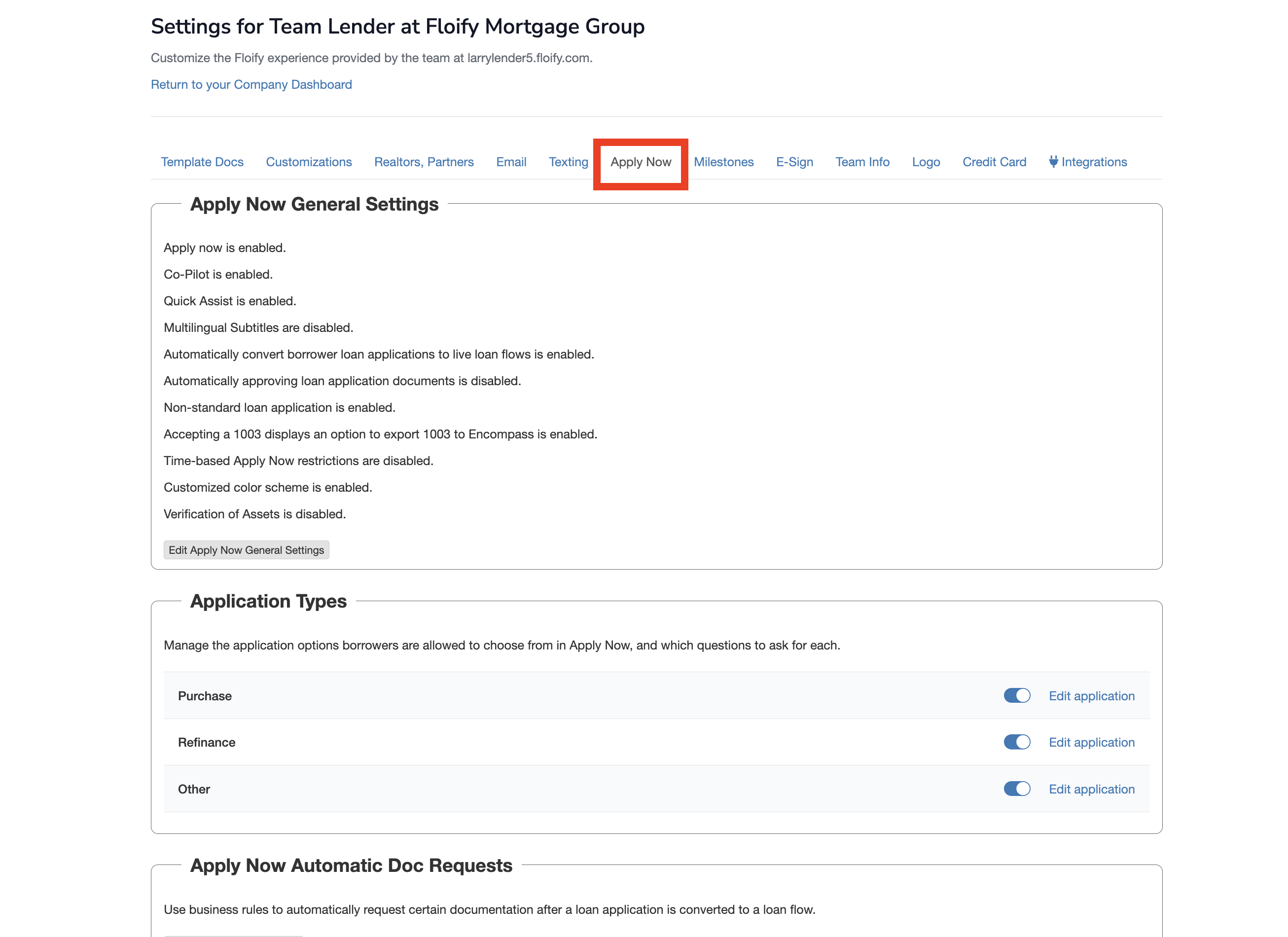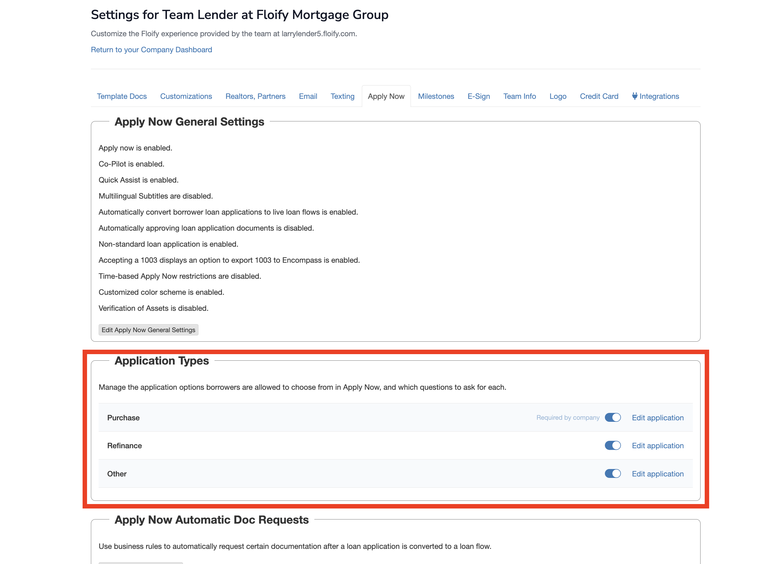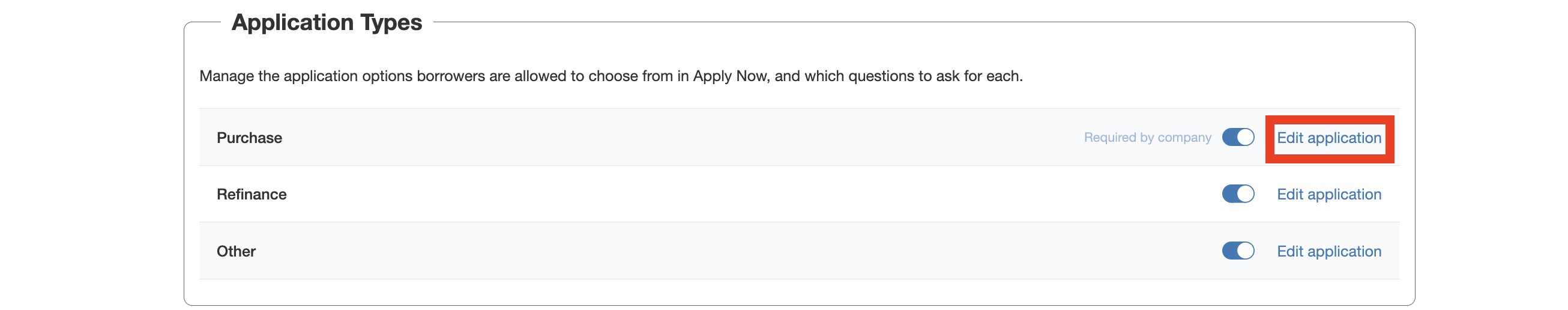 You can select the application types you would like your teams to have enabled for from among Purchase, Refinance, and Other, and can choose if they are required for usage by teams by selecting the drop down menu associated with each type