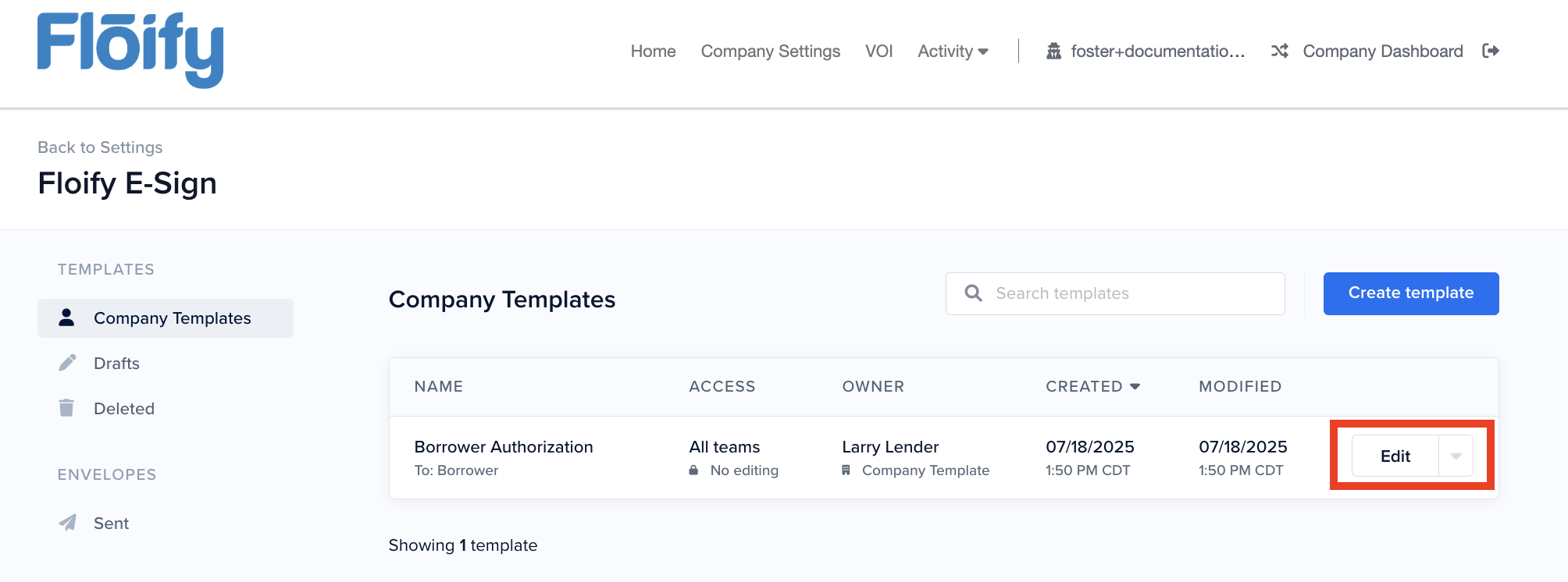Among these settings, you'll have access to edit a Floify E-Sign template.