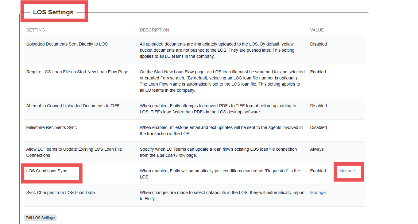 Go to Company Settings > Basic Settings > LOS Settings > LOS Conditions Sync > Manage.