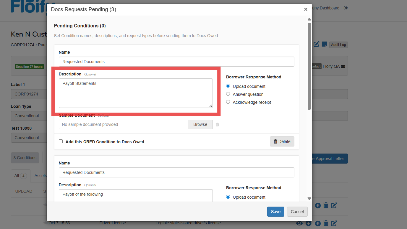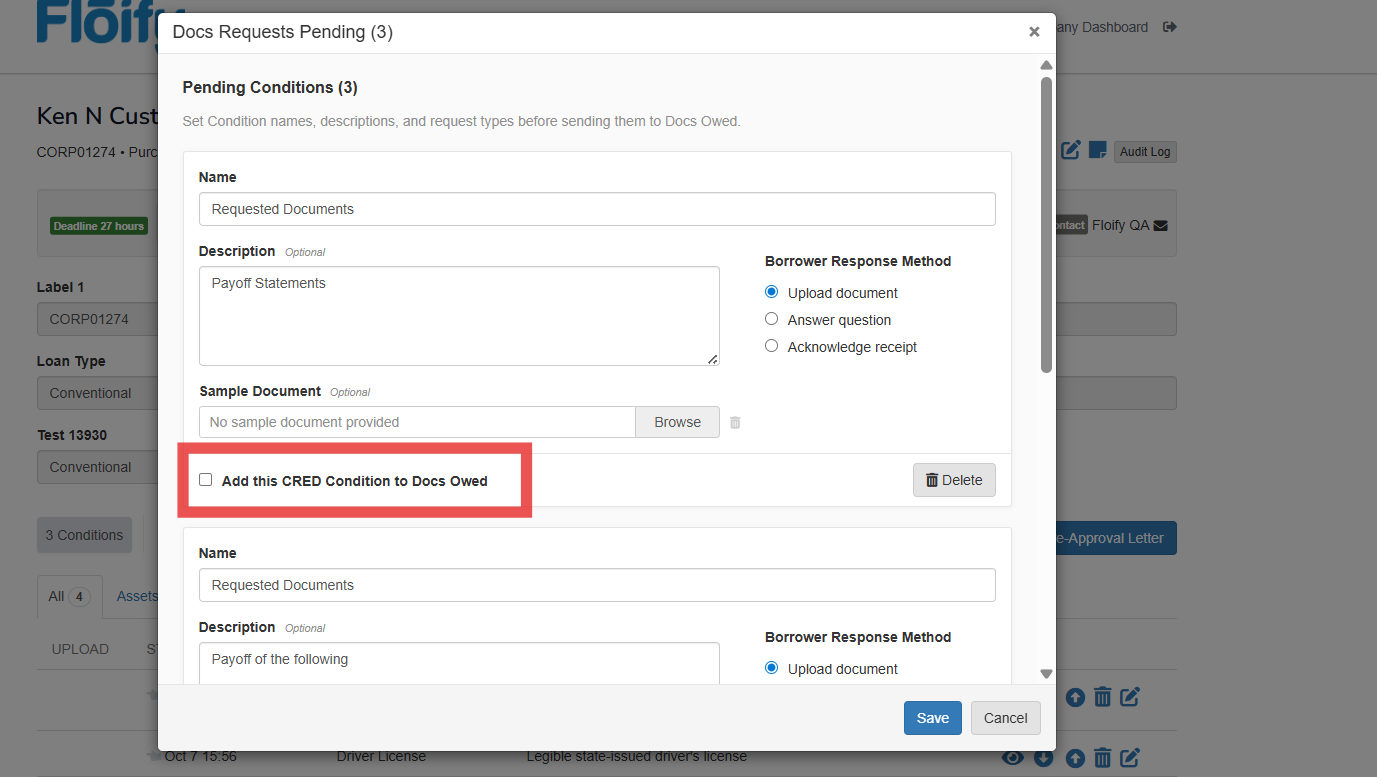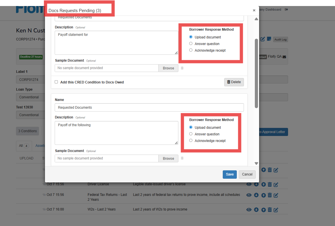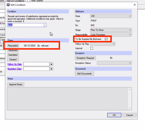 When synced, condition names and descriptions appear in the Borrower Portal as new document requests, ensuring a consistent borrower experience across both systems.