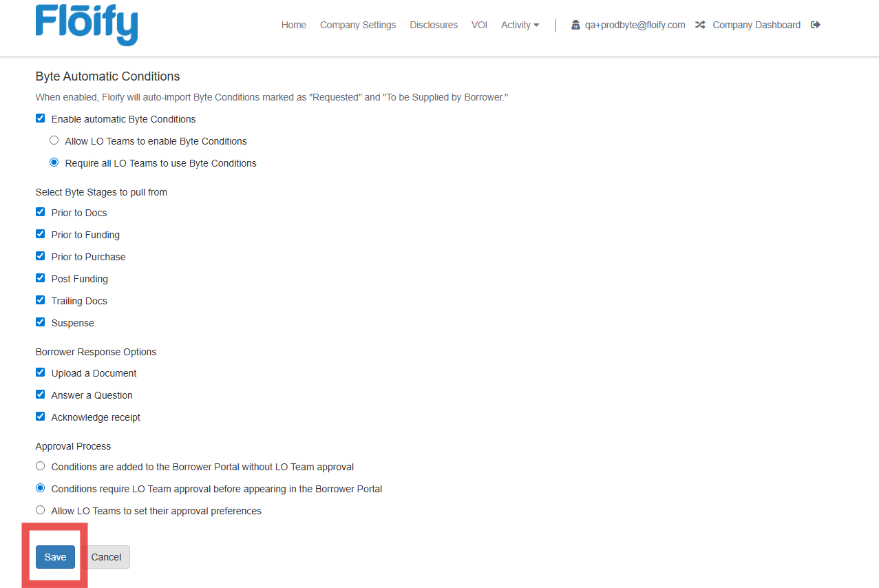 The Byte Conditions Sync feature allows Floify to automatically pull loan conditions from Byte LOS into Floify document requests.