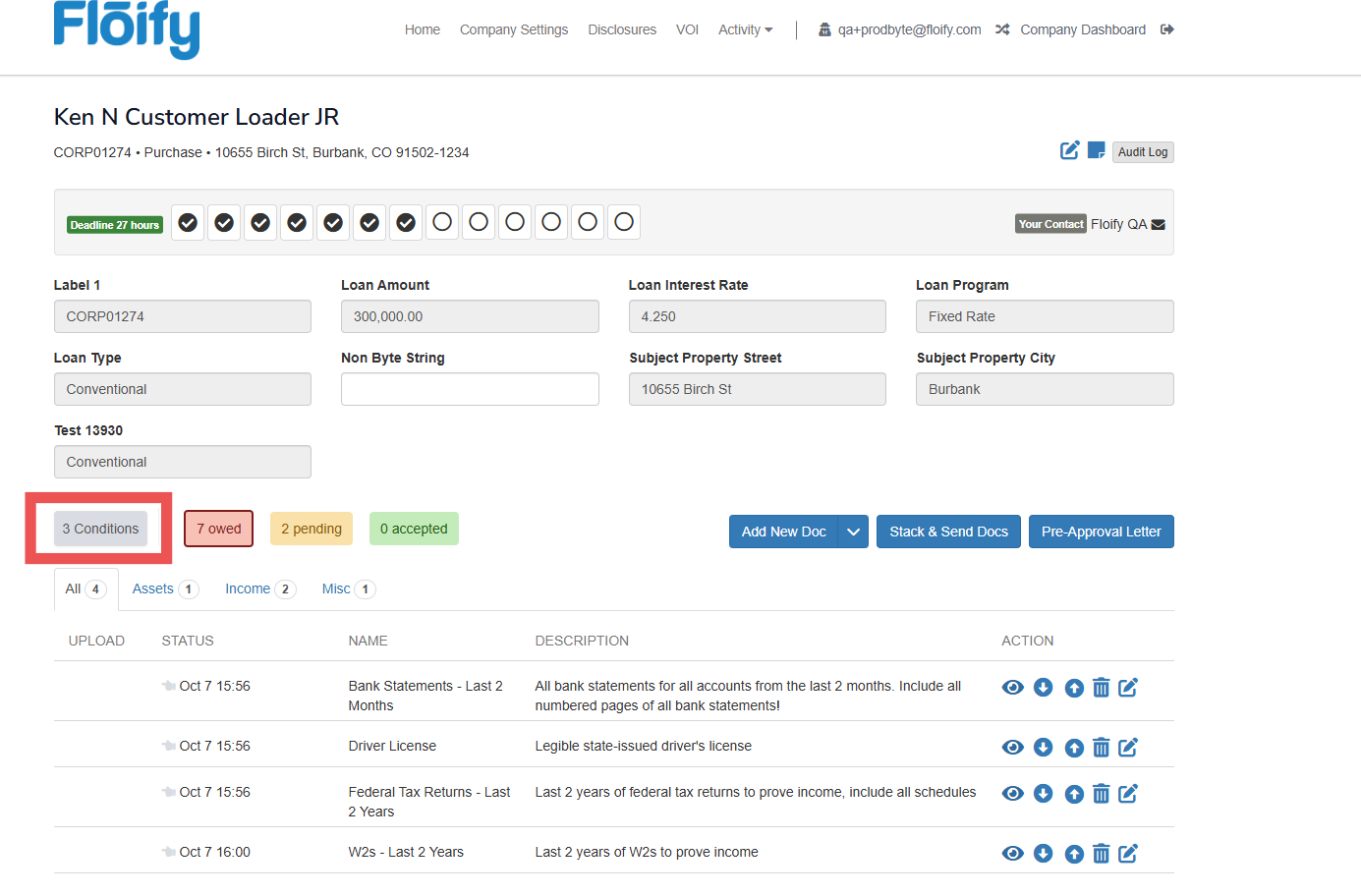 When enabled, Floify retrieves conditions marked as “Requested” from Byte and adds them as document requests in the Borrower Portal. Conditions can appear either automatically or after loan officer approval, depending on your company-level configuration.