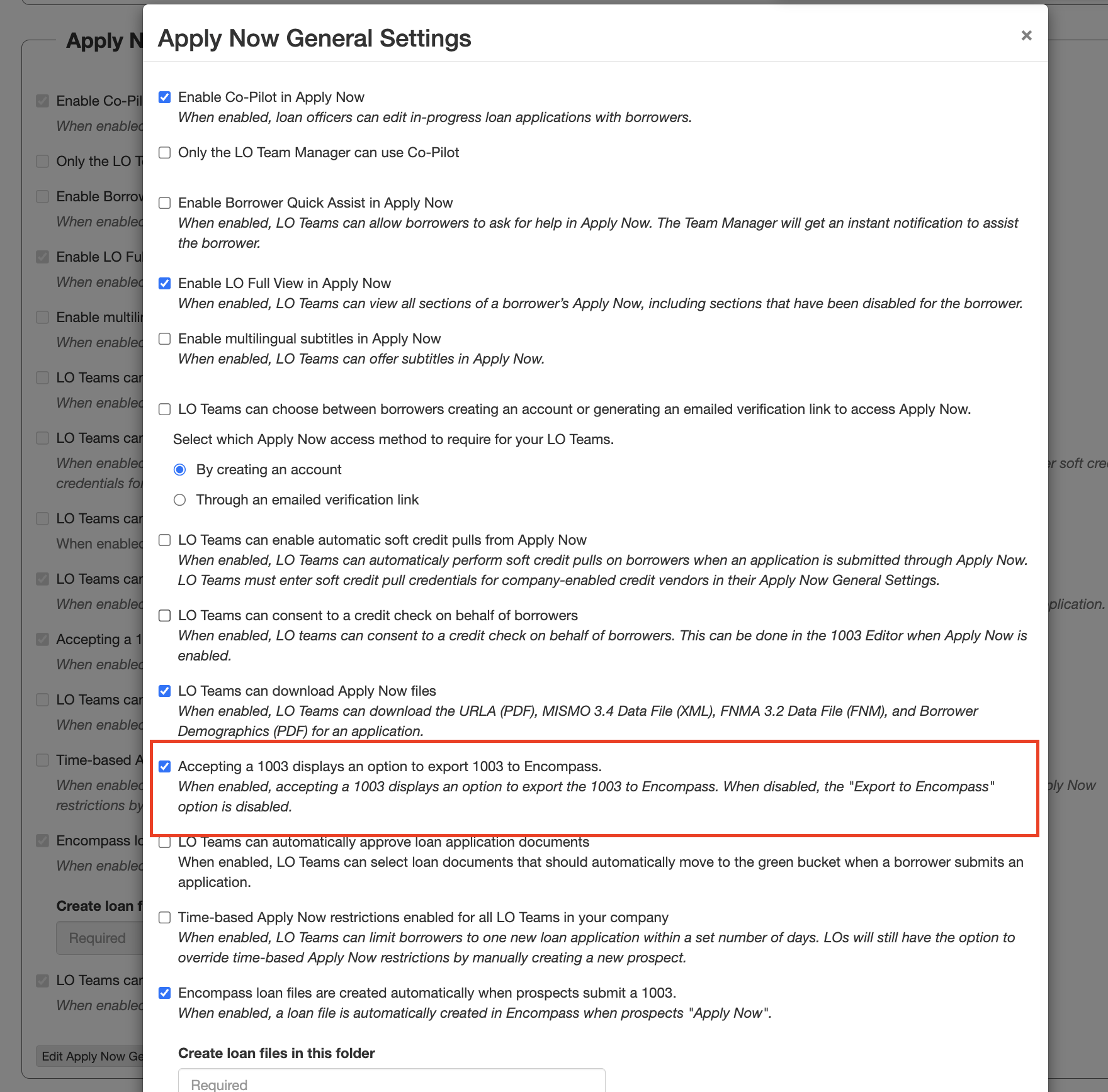 From there, enable the option labelled Accepting a 1003 displays an option to export 1003 to Encompass. Scroll down and press Save to apply the changes.
