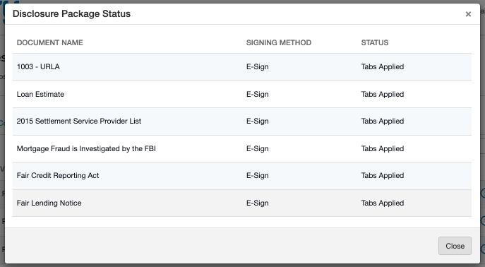 On the Status page, you will see a list of all of the documents in the disclosure package in the "Document Name" column, whether they are Informational or to be e-Signed in the "Signing Method" column, and the current status of each individual document in the "Status" column.